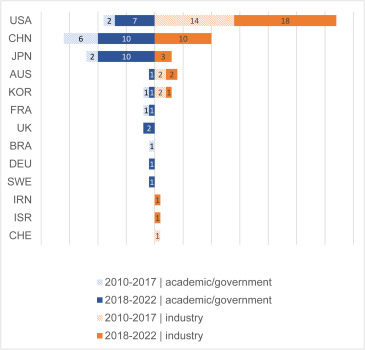 各國之間存在明顯差異。在美國,行業贊助的試驗數量超過學術/政府贊助的試驗(分別為32項和9項),甚至在2018年之前就具有很強的代表性,而中國和日本僅在過去5年內才開始有行業贊助的試驗,并且由于強大的國家資助計劃,他們的大部分試驗仍然主要由學術/政府贊助(袁等,2012;‘江之澤,2022年;李2022)。