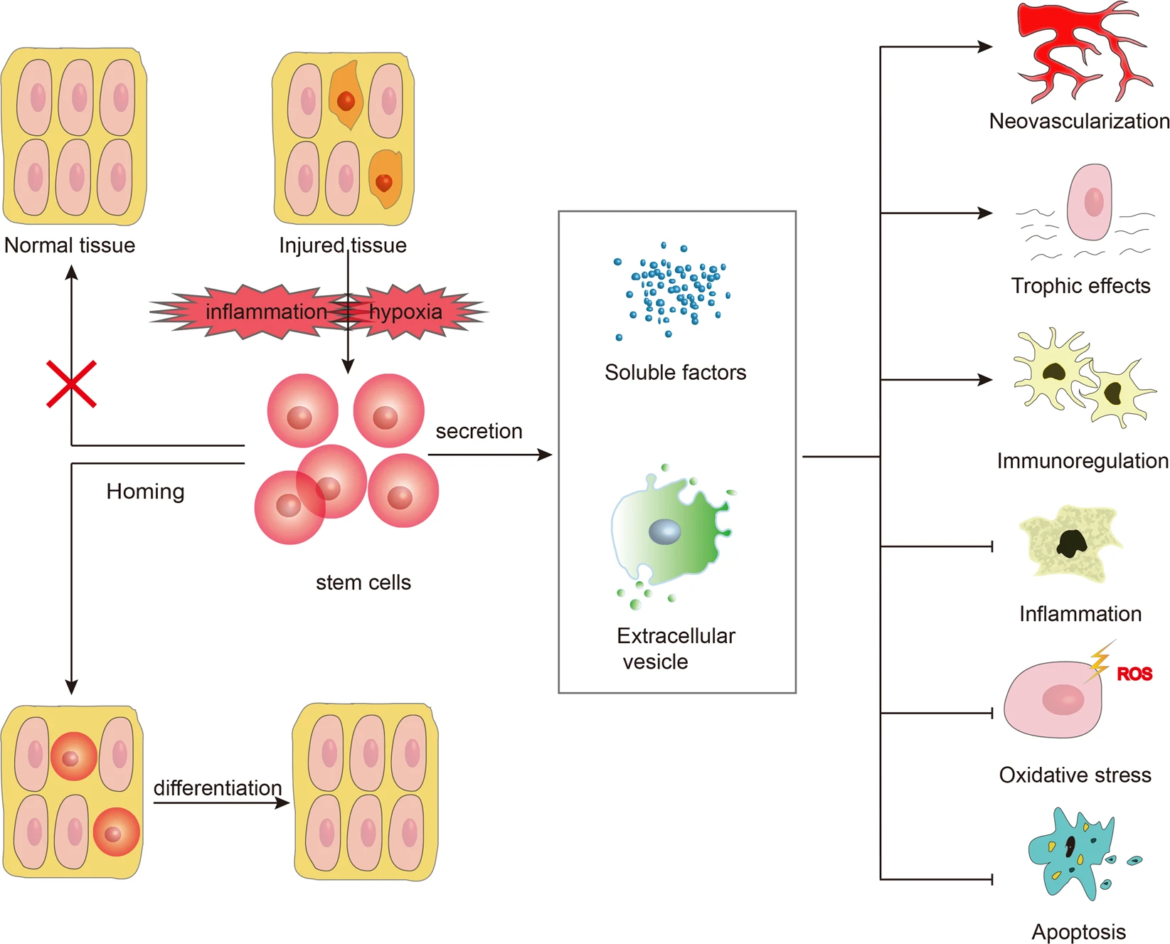 另一種是營養效應(圖1)。 干細胞通過促進旁分泌、內分泌或自分泌機制發揮作用,例如有絲分裂、新血管形成、抗炎、細胞保護、抗生產和免疫調節。