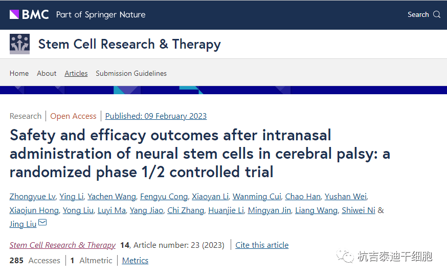 2023年2月,大連醫科大學第一附屬醫院劉晶教授在《StemCell Research &Therapy》期刊雜志上發表了一篇關于《腦癱神經干細胞鼻內給藥后的安全性和有效性結果:一項隨機1/2期對照試驗》的論文。