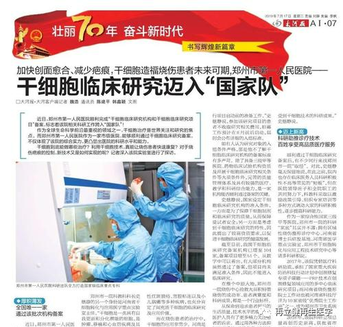 2019年,CCTV央視網(wǎng)曾于《壯麗70年 奮斗新時代》慶祝建國70周年的專題欄目中收錄了河南大河報一篇名為《加快創(chuàng)面愈合、減少疤痕,干細(xì)胞造福燒傷患者未來可期,鄭州市第一人民醫(yī)院——干細(xì)胞臨床研究邁入“國家隊” 》的報道。