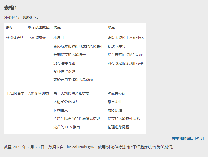 至少有150項(xiàng)臨床試驗(yàn)已在ClinicalTrials.gov上注冊(cè),研究基于外泌體的療法治療多種疾病,包括呼吸道疾病、傳染病和癌癥(在 www.clinicaltrials.gov上使用“外泌體療法”作為關(guān)鍵詞搜索)。在這些試驗(yàn)中,31項(xiàng)應(yīng)用源自干細(xì)胞(主要是來(lái)自不同組織的間充質(zhì)干細(xì)胞)的外泌體,并作為間充質(zhì)干細(xì)胞療法的替代方案進(jìn)行測(cè)試。這些臨床前和臨床研究表明,干細(xì)胞釋放的外泌體可能部分重現(xiàn)其供體細(xì)胞的治療效果,而沒(méi)有干細(xì)胞治療固有的缺點(diǎn)(表1)。