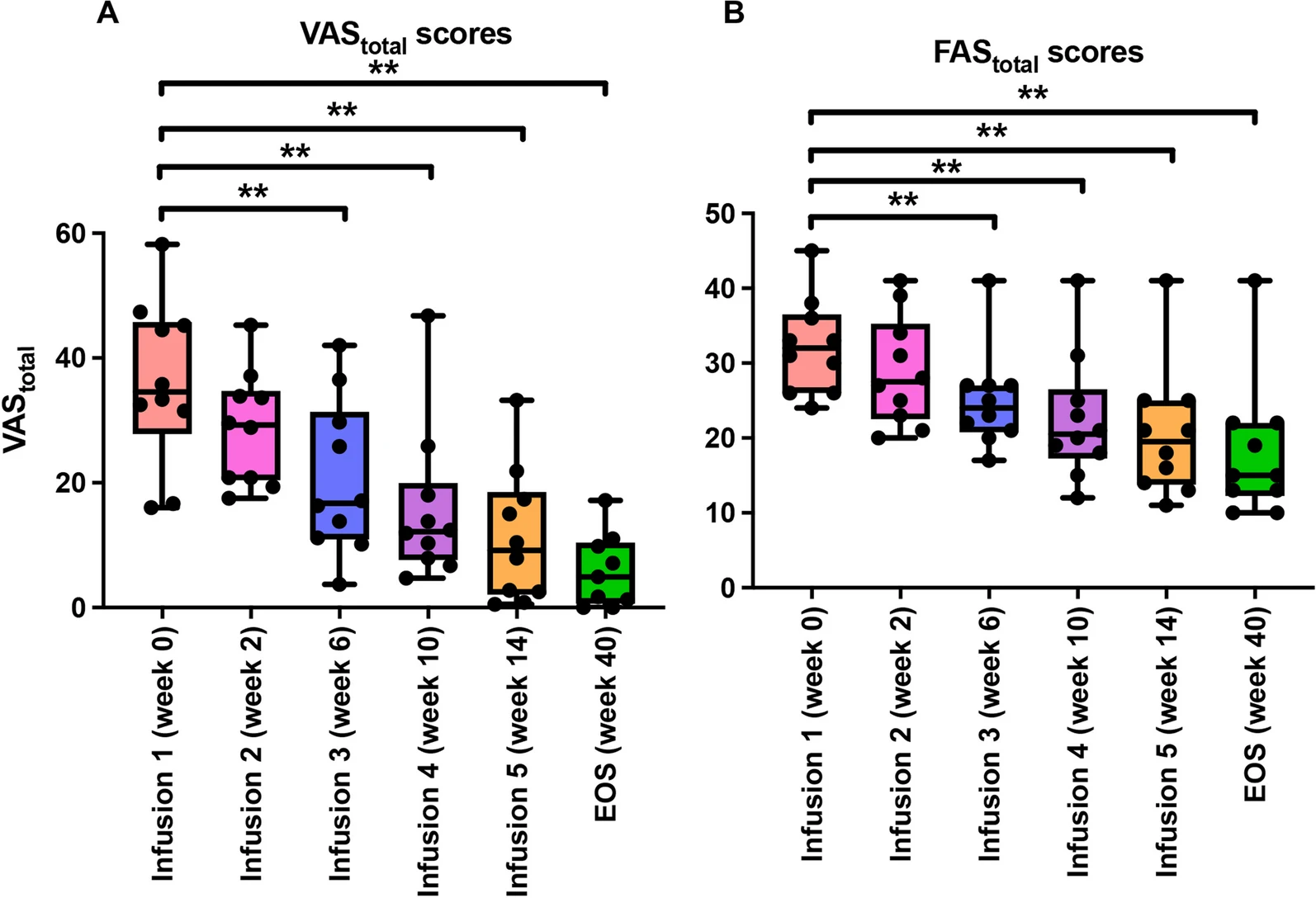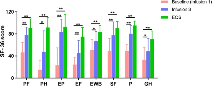 視覺(jué)模擬量表(VAS)和疲勞評(píng)估分?jǐn)?shù)(FAS):與基線(xiàn)(第0周,輸注#1)相比,研究期結(jié)束時(shí)VAS總分和FAS總分均顯示出顯著改善,中位值從37.6 (IQR33.1–44.3) 下降至4.90 ( IQR : 1.3–9.8)的VAS總分(P值0.0039)和FAS總分(P值 0.0039 )分別從32.5 (IQR:27.0–35.0) 到15.0 (IQR:13.0–19.0) ,效應(yīng)量較大(圖2A&B,表2)。