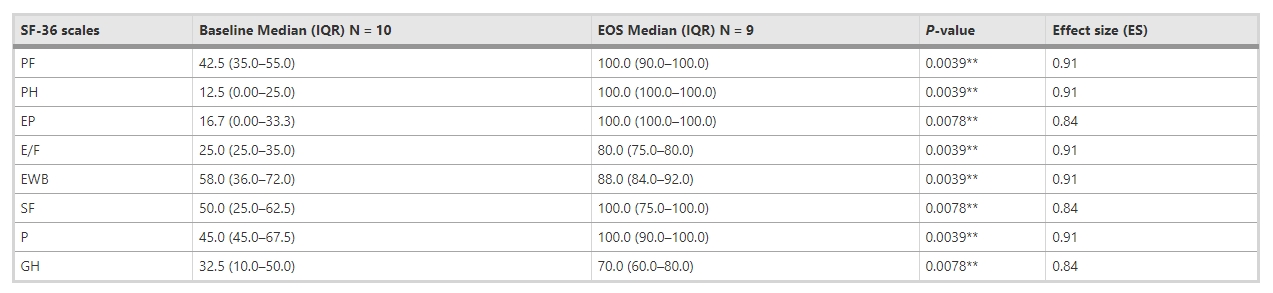 SF-36調(diào)查問(wèn)卷:基線(xiàn)和EOS SF-36評(píng)分之間的配對(duì)比較顯示,生活質(zhì)量得到改善,個(gè)人SF-36評(píng)估發(fā)生顯著變化(圖3、表3)。