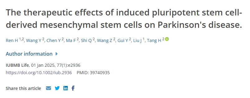 2025年1月1號,湖南大學(xué)化學(xué)化工學(xué)院進(jìn)行了一項(xiàng)誘導(dǎo)多能干細(xì)胞衍生的間充質(zhì)干細(xì)胞治療帕金森病小鼠模型的研究。該研究結(jié)果發(fā)表在“IUBMB Life”研究主頁。