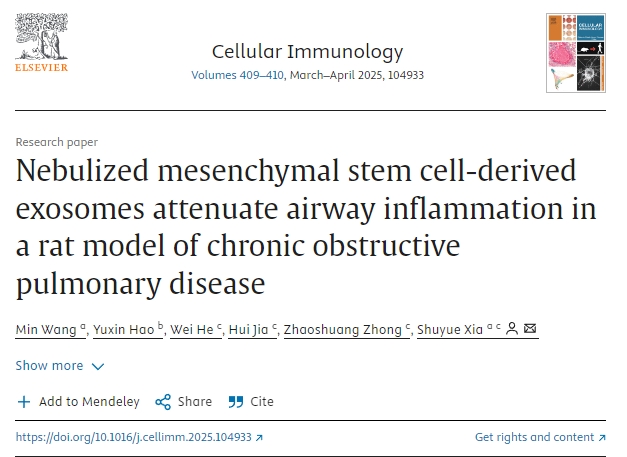[2]Min Wang, Yuxin Hao, Wei He, Hui Jia, Zhaoshuang Zhong, Shuyue Xia,Nebulized mesenchymal stem cell-derived exosomes attenuate airway inflammation in a rat model of chronic obstructive pulmonary disease,Cellular Immunology,Volumes 409–410,2025,104933,ISSN 0008-8749,https://doi.org/10.1016/j.cellimm.2025.104933.