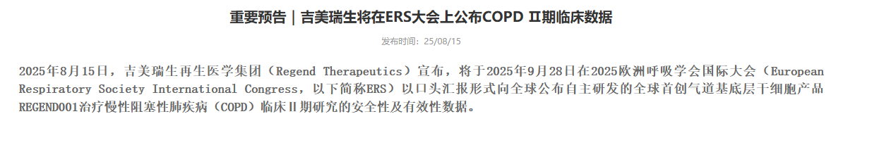 8月15日,上海瑞金落地的慢阻肺干細(xì)胞治療臨床實(shí)驗(yàn)室吉美瑞生再生醫(yī)學(xué)集團(tuán)(Regend Therapeutics)正式宣布,將在2025年9月28日于荷蘭阿姆斯特丹舉辦的歐洲呼吸學(xué)會國際大會(ERS)上,以口頭匯報(bào)形式向全球披露其自主研發(fā)的全球首創(chuàng)氣道基底層干細(xì)胞產(chǎn)品REGEND001,在治療慢性阻塞性肺疾病(COPD)臨床Ⅱ期研究中的安全性與有效性核心數(shù)據(jù),為全球慢阻肺病治療領(lǐng)域帶來新的關(guān)注焦點(diǎn)。[9]