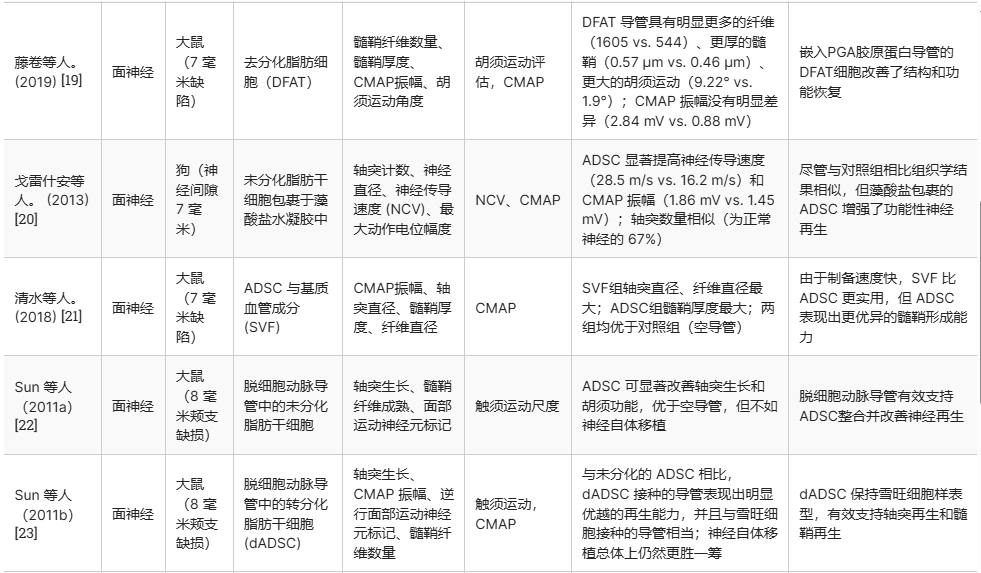 - 面神經:觸須運動評分和面癱評分系統均顯示ADSC組功能顯著改善;動物實驗證實dADSC使觸須運動角度提升近5倍(9.22°vs1.90°)。