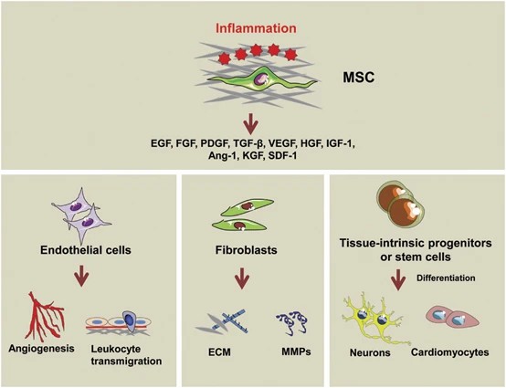 MSCs 的組織修復特性。在受損組織部位受到不同炎癥細胞因子的刺激下,新移入的間充質干細胞會釋放大量生長因子,包括 EGF、FGF、PDGF、TGF- β、VEGF、HGF、Ang-1、KGF、SDF-1、IGF-1 等。