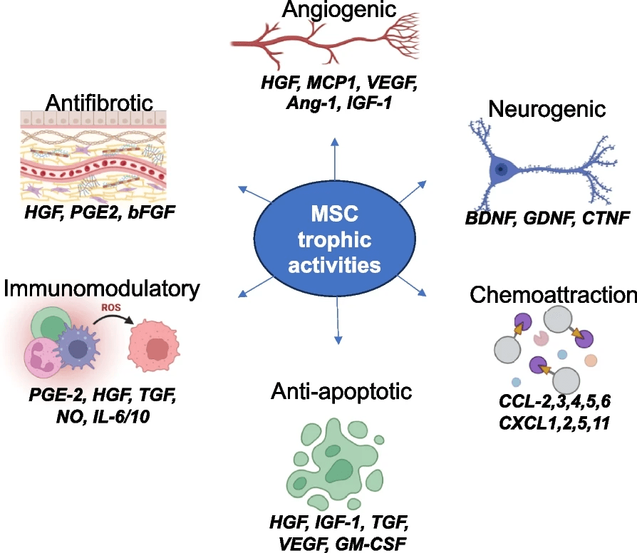 具體而言,已知MSC分泌的因子可介導(dǎo)血管生成、有絲分裂、抗纖維化、抗凋亡、抗瘢痕形成和神經(jīng)源性功能(圖1)。