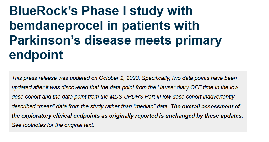 2023年10月2日,拜耳公司子公司 BlueRock Therapeutics LP 今天公布了 bemdaneprocel (BRT-DA01) I 期臨床試驗(yàn)的積極數(shù)據(jù)詳情,bemdaneprocel 是一種用于治療帕金森病的干細(xì)胞衍生試驗(yàn)療法。