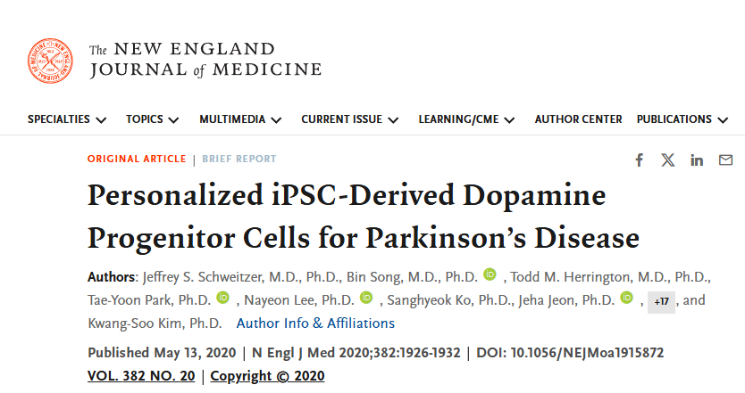 2020年5月13日,麻省總醫院神經外科在國際期刊《 The New England Journal of Medicine》上發布了一篇《個性化 iPSC 衍生的多巴胺祖細胞用于治療帕金森病》的研究結果。