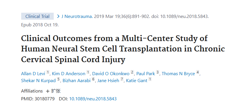 2019年3月19日,邁阿密大學米勒醫(yī)學院在國際期刊《Journal of Neurotrauma》上發(fā)布了一篇《人類神經(jīng)干細胞移植治療慢性頸脊髓損傷的多中心研究的臨床結(jié)果》的研究結(jié)果。