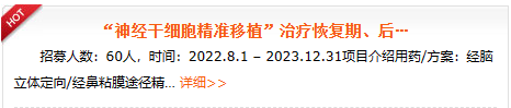 經鼻內鏡精準移植神經干細胞:2022年8月1日起至2023年12月31日,解放軍總醫院第六醫學中心啟動了一項“神經干細胞精準移植”治療恢復期及后遺癥期腦梗死患者的I期臨床研究。經腦立體定向/經鼻粘膜途徑精準移植神經干細胞。