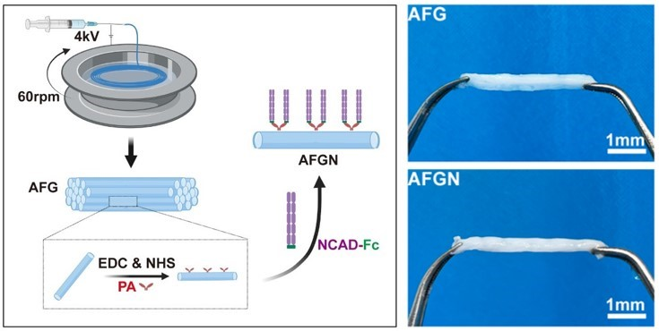 神經干細胞聯合水凝膠材料:2023年4月,清華大學材料學院王秀梅團隊和北京清華長庚醫院神經外科王貴懷團隊通過醫工交叉合作,開發了一種新型的N-鈣粘蛋白(NCAD)修飾的功能化定向納米纖維水凝膠(AFGN),為NSC“量身定制”適宜的遞送和生長微環境,聯合治療脊髓損傷(如下圖)。
