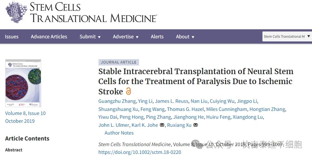 該項Ⅰ期研究發在國際期刊雜志《Stem Cells Translational Medicine》上,這項研究結果表明,Ⅰ期臨床研究結果反響良好,顯示出一種特殊的人源神經干細胞系對于偏癱性中風(身體的一側無力或癱瘓)后運動功能恢復的治療潛力。