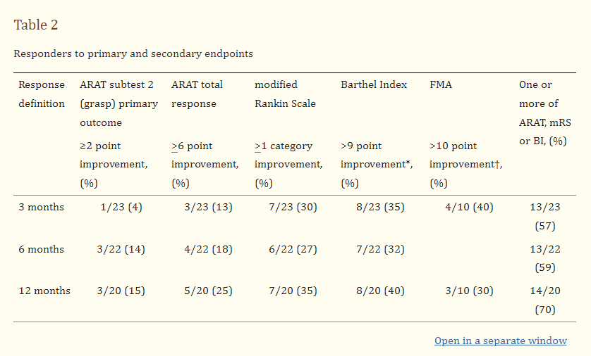 主要結(jié)果:在3個(gè)月時(shí),一名患者在ARAT項(xiàng)目2上表現(xiàn)出≥2分改善。三名患者在6個(gè)月和12個(gè)月時(shí)表現(xiàn)出反應(yīng):一名在6個(gè)月時(shí)表現(xiàn)出反應(yīng)的患者在12個(gè)月時(shí)沒(méi)有達(dá)到反應(yīng),但在其他ARAT測(cè)試項(xiàng)目(5cm3和7.5cm3塊)。
