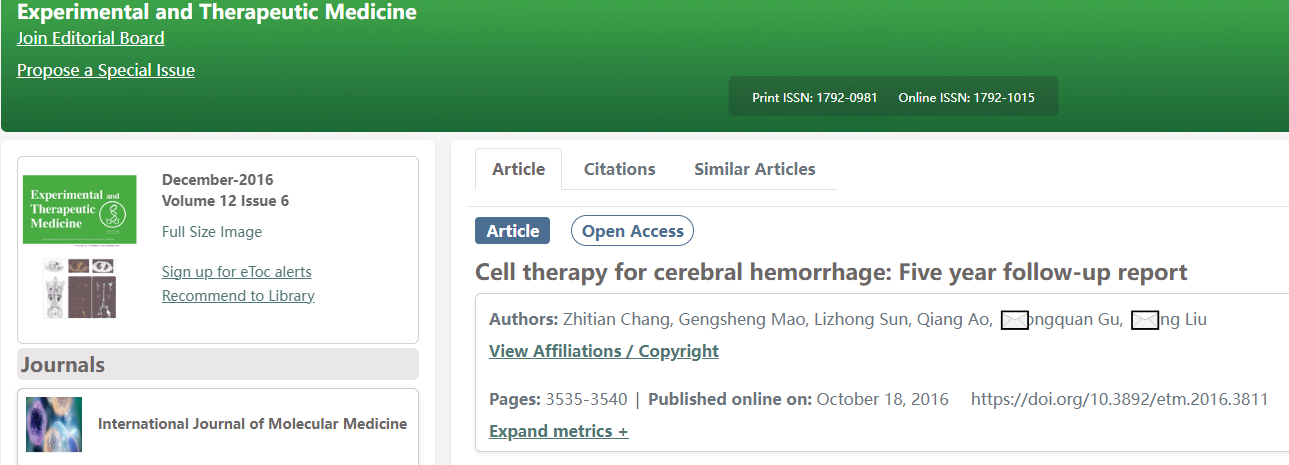 2016年,Chang等通過一項(xiàng)“細(xì)胞療法治療腦出血:五年隨訪報(bào)告”研究發(fā)現(xiàn),在患有中重度ICH后遺癥(超過60個(gè)月)的患者中,骨髓或臍帶MSC移植的功能恢復(fù)優(yōu)于單獨(dú)的手術(shù)血腫清除。