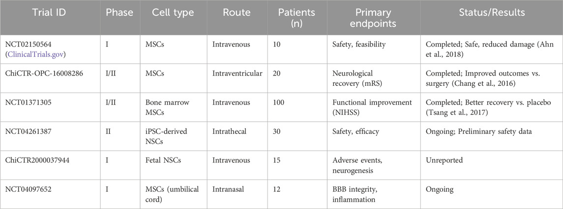 相反,中國臨床試驗(yàn)注冊(cè)中心(www.chictr.org.cn)列出了16項(xiàng)NSC試驗(yàn),大部分針對(duì)缺血性卒中,包括外泌體療法、腦癱、卒中后遺癥和脊髓損傷,作為單中心或多中心研究進(jìn)行。干細(xì)胞通常來源于易獲取的臍帶或骨髓,往往在較晚階段(ICH后數(shù)周至一年多)而非急性期給藥,這反映了初期生命救援措施的優(yōu)先級(jí)。(見表2的關(guān)鍵臨床試驗(yàn)總結(jié))。
