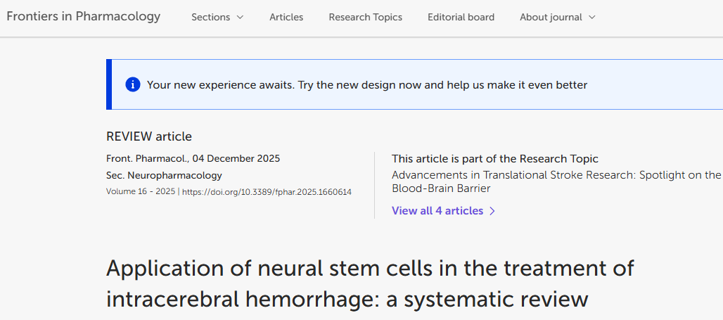 [1]Song P, Shafiq Z, Jiang H and Cai Q (2025) Application of neural stem cells in the treatment of intracerebral hemorrhage: a systematic review. Front. Pharmacol. 16:1660614. doi: 10.3389/fphar.2025.1660614