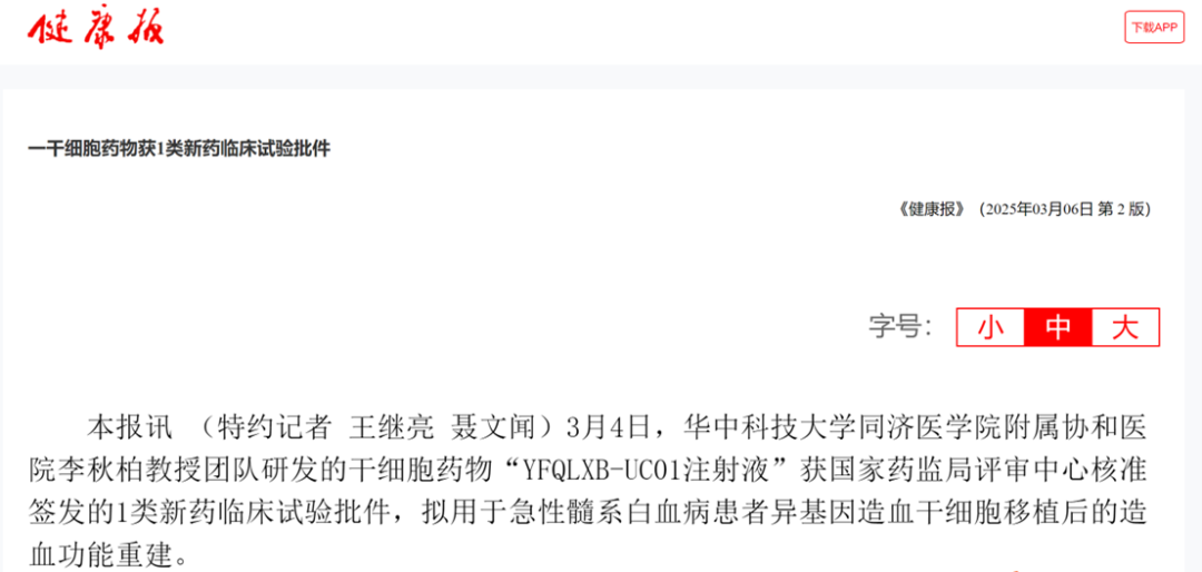 2025年3月4日,該院李秋柏教授團隊研發的干細胞藥物“YFQLXB-UC01注射液”成功獲得國家藥監局評審中心核準簽發的1類新藥臨床試驗批件(受理號:CXSL2400857),擬用于急性髓系白血病(AML)患者異基因造血干細胞移植(allo-HSCT)后的造血功能重建。此次獲批不僅是國家重點研發計劃干細胞專項的首個臨床新藥突破,也是華中科技大學附屬協和醫院研發計劃團隊在干細胞IND新藥領域的里程碑進展。