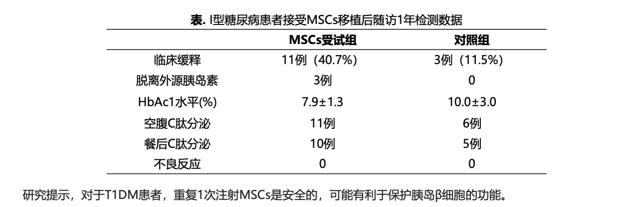 通過這個(gè)數(shù)據(jù)可以看出,通過間充質(zhì)干細(xì)胞治療的27例患者中,3例患者是脫離了外源胰島素,也就是說自身已經(jīng)可以開始分泌胰島素了。這是過往傳統(tǒng)的治療方法所無法做到的。11例患者得到緩解,也就是外源胰島素用量降低。而剩下的13例,則沒有太大變化。這很有可能是干細(xì)胞被其他組織器官“拐走了”。