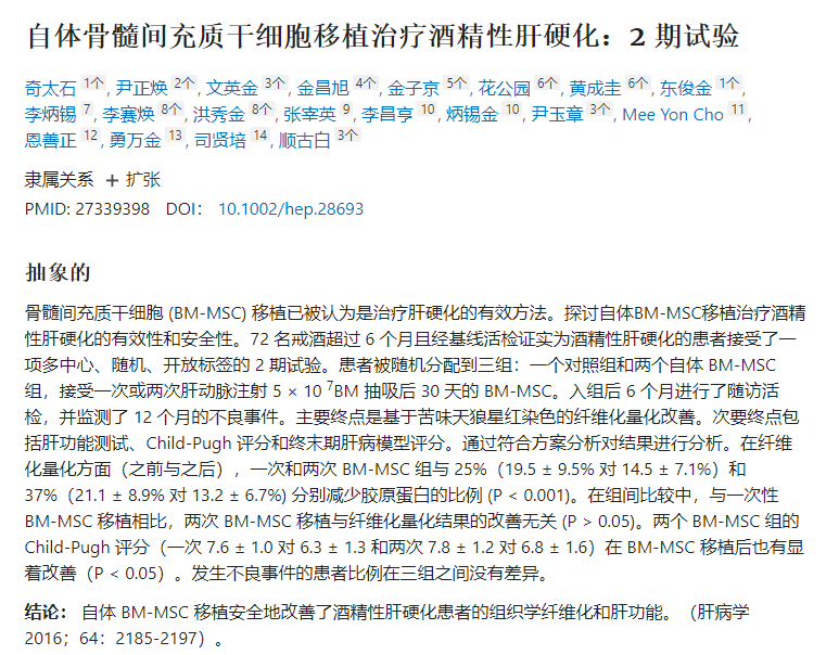 在一項多中心、隨機、開放標簽的2期試驗中,自體骨髓間充質干細胞移植安全地改善了肝功能,并促進了酒精性肝硬化患者肝活檢后纖維化的量化。