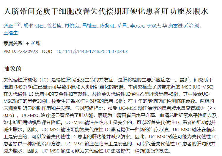 另一項來自中國的開放標簽、配對、對照研究表明,臍帶來源的間充質干細胞 (UC-MSCs) 移植也改善了慢性乙型肝炎 (CHB) 患者和失代償期LC患者的肝功能并減少了腹水。MSC移植也被證明可以改善患有自身免疫性疾病的LC患者的肝功能。