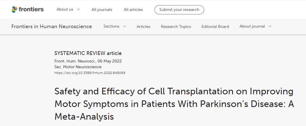 參考資料:Wang J, Tian Y, Shi X, Feng Z, Jiang L and Hao Y (2022) Safety and Efficacy of Cell Transplantation on Improving Motor Symptoms in Patients With Parkinson’s Disease: A Meta-Analysis. Front. Hum. Neurosci. 16:849069. doi: 10.3389/fnhum.2022.849069。