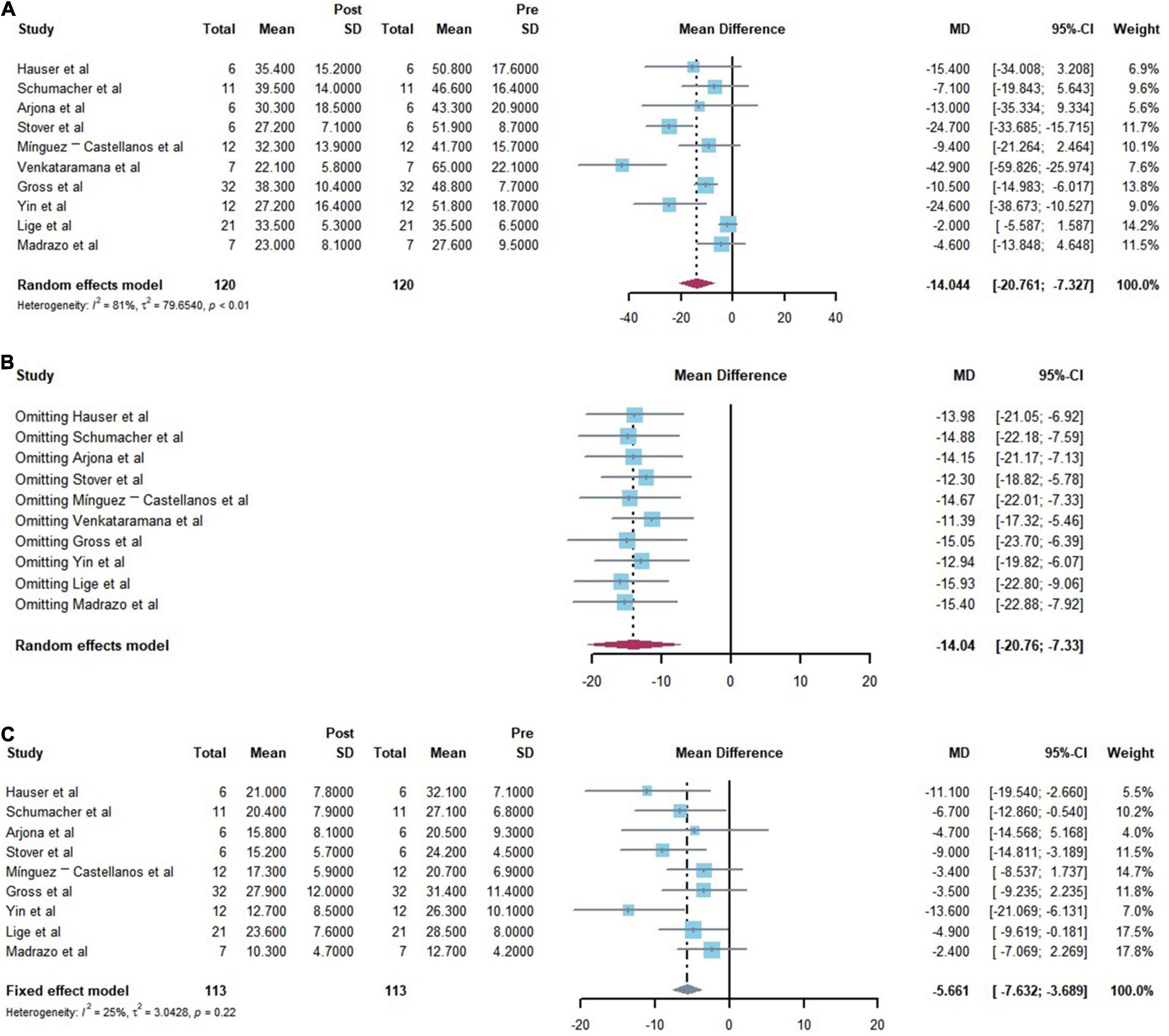 (A)統(tǒng)一帕金森病評定量表 (UPDRS) III運動功能主要結(jié)果分析的森林圖。