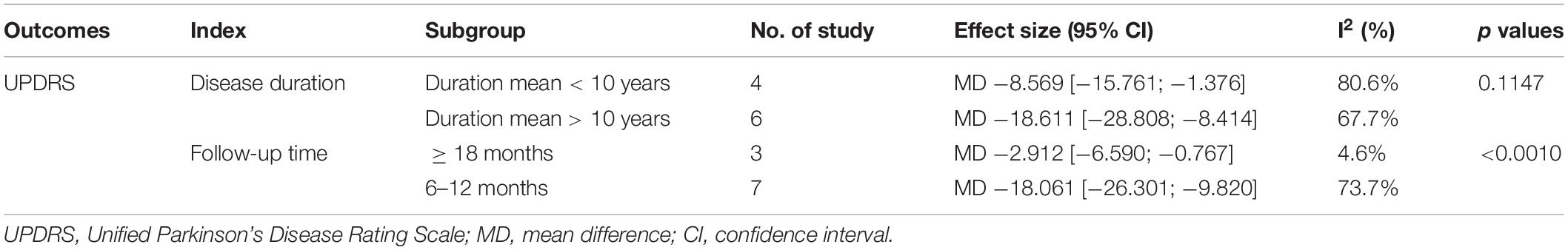 基于不同平均持續(xù)時間的結(jié)果:平均持續(xù)時間<10 年-8.569(95%CI:-15.761;-1.376)I2=80.6%;持續(xù)時間平均值>10年-18.611(95% CI:-28.808;-8.414)I2=67.7%;(亞組差異檢驗:P=0.115)。