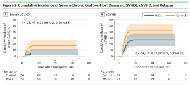 MSCs組cGVHD預估2年累積發病率15.8%(95%CI,8.6%-26.6%),對照組26.2%(95%CI,16.8%-37.9%),HR為0.57(95%CI,0.33-0.98,圖2B)。