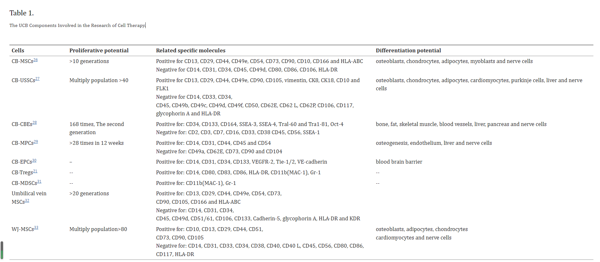CB-MSCs:臍帶血間充質干細胞;CB-USSCs:臍帶血來源的非限制性成體干細胞;CB-CBEs:臍帶來源的胚胎樣干細胞;CB-MPCs:臍帶血來源的多能祖細胞;CB-EPCs:臍帶血來源的內皮祖細胞;CB-Tregs:臍帶血來源的T調節細胞;CB-MDSCs:臍靜脈間充質干細胞;WJ-MSCs:沃頓氏膠質間充質干細胞;SSEA:階段特異性胚胎抗原;HLA:人類白細胞抗原;VEGF:血管內皮生長因子;MAC-1:巨噬細胞-1抗原。
