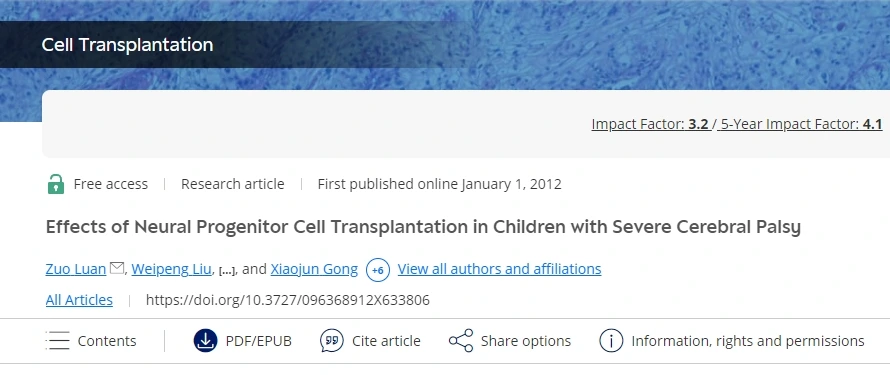 Luan Z, Liu W, Qu S, et al. Effects of Neural Progenitor Cell Transplantation in Children with Severe Cerebral Palsy.?Cell Transplantation. 2012;21(1_suppl):91-98. doi:10.3727/096368912X633806
