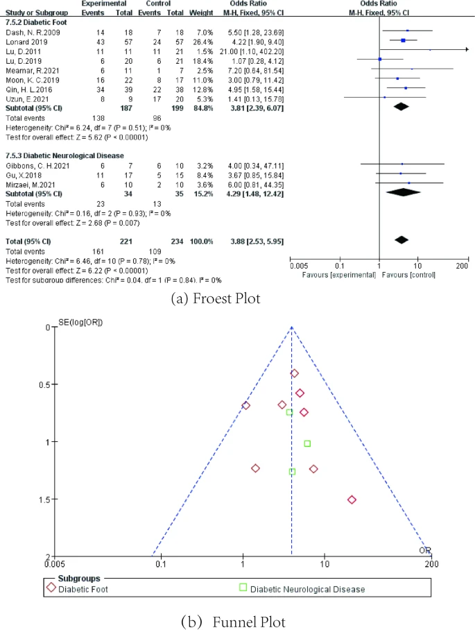 基于11項(xiàng)研究(8項(xiàng)足潰瘍、3項(xiàng)神經(jīng)病變)的數(shù)據(jù)顯示,兩組療效高度一致,且組間無顯著差異(P=0.84)。異質(zhì)性檢驗(yàn)(I2=0)及森林圖分布(圖10b)證實(shí)結(jié)果高度可靠,提示MSCs對(duì)不同糖尿病并發(fā)癥的療效具有普適性,為臨床擴(kuò)展應(yīng)用提供了證據(jù)支持。
