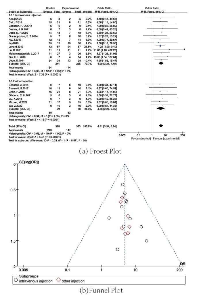 本研究通過薈萃分析評(píng)估不同MSCs注射方式對(duì)糖尿病治療的療效差異。基于20項(xiàng)研究(12項(xiàng)靜脈注射、8項(xiàng)其他注射)的數(shù)據(jù)進(jìn)行分析。
