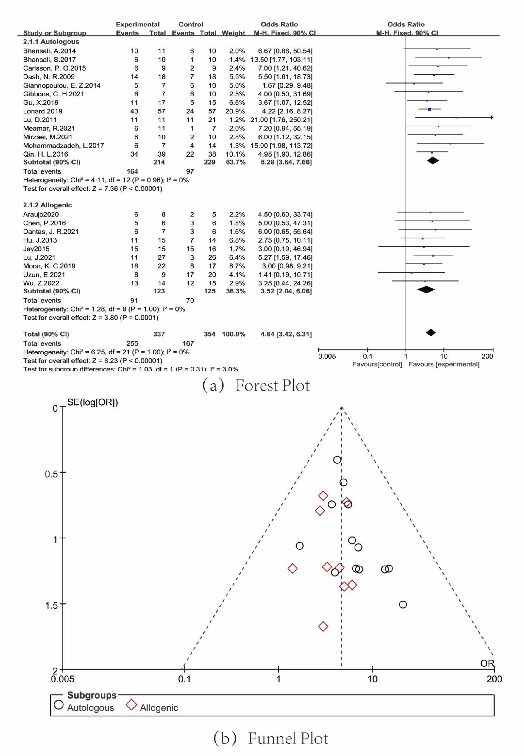 自體干細(xì)胞來源包括骨髓、臍帶、脂肪和胎盤。在確保自體MSCs療效優(yōu)于同種異體MSCs后,進(jìn)一步分析了BMMSCs和其他MSCs兩大類。