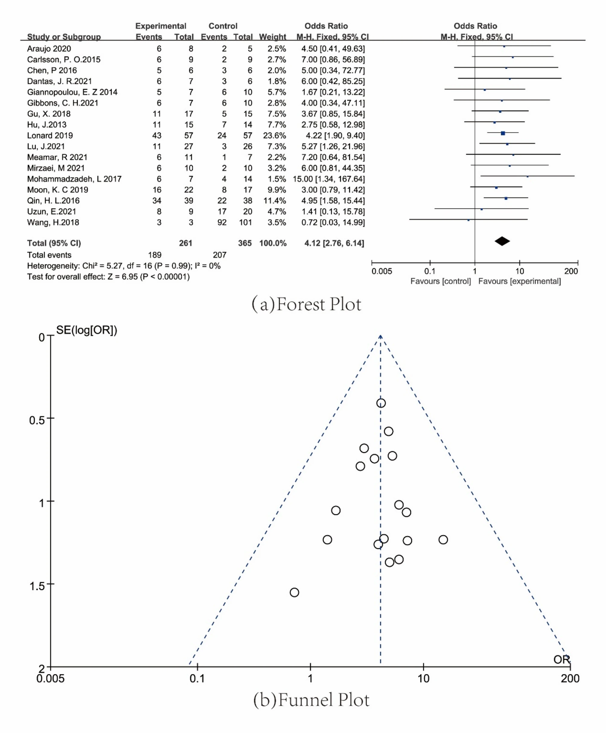 數(shù)據(jù)顯示:靜脈注射組(實(shí)驗(yàn)事件241例,對(duì)照255例)OR值為4.90,其他注射組(實(shí)驗(yàn)事件79例,對(duì)照78例)OR值為4.56,表明兩種策略療效相近,無論靜脈或肌肉/肘前靜脈注射,MSCs均能顯著改善糖尿病(圖9)。