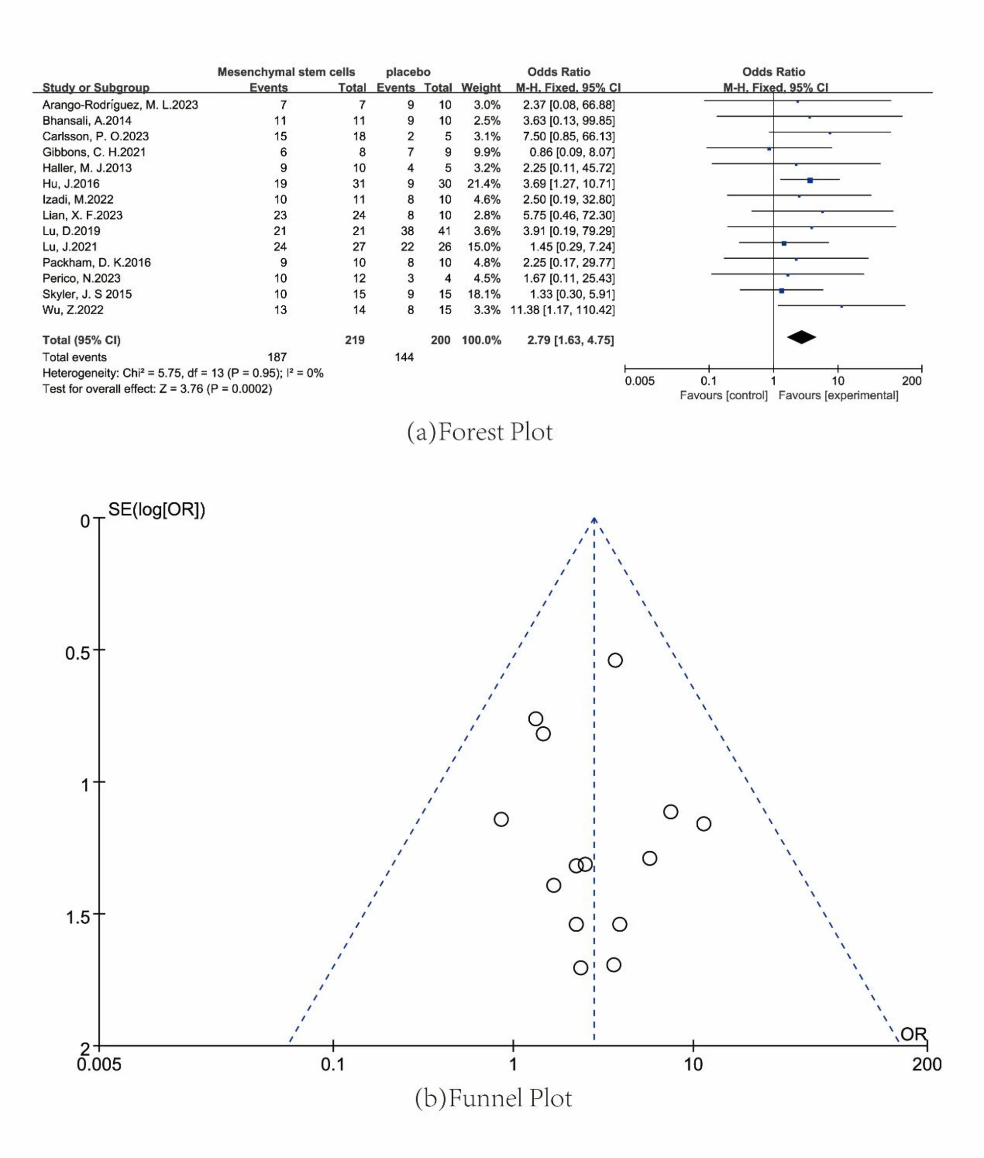 通過效應(yīng)量對(duì)比與統(tǒng)計(jì)學(xué)驗(yàn)證,MSCs在兩類糖尿病中均顯示臨床價(jià)值,但I(xiàn)I型糖尿病療效更顯著。研究揭示了MSCs療效的疾病類型依賴性,為精準(zhǔn)治療策略提供了依據(jù),同時(shí)高可靠性的數(shù)據(jù)分布(圖8b)支持結(jié)論的科學(xué)嚴(yán)謹(jǐn)性,提示未來需針對(duì)糖尿病分型優(yōu)化MSCs臨床應(yīng)用方案。