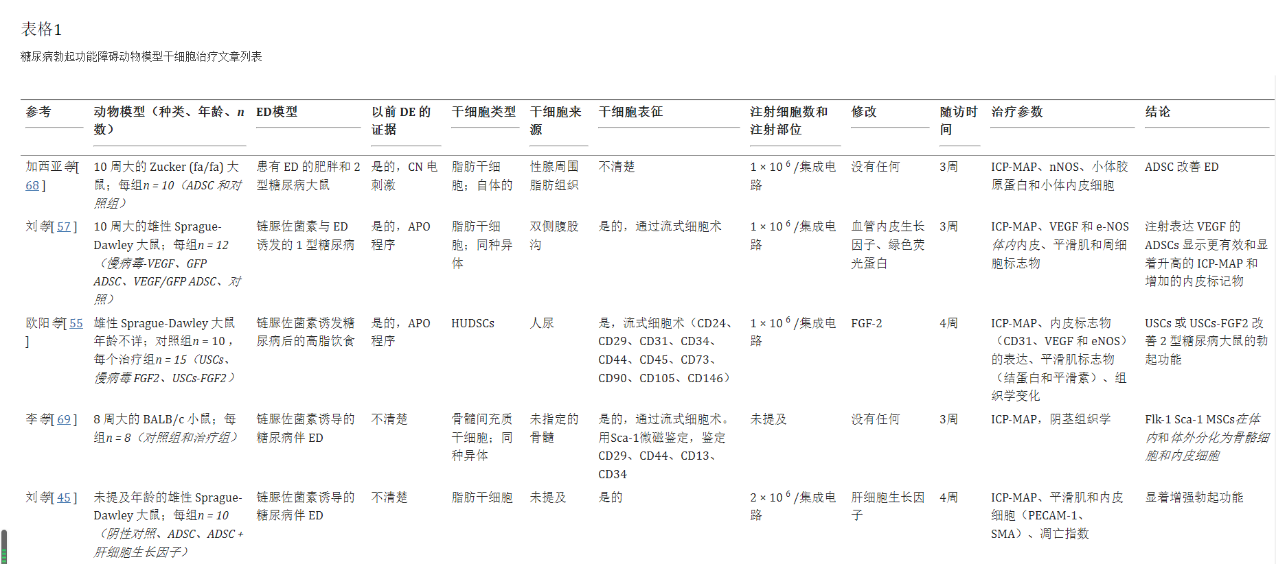 自2000年代以來,就一直在開展ED病例的干細胞研究。然而,大多數(shù)研究僅限于實驗動物。在本文回顧的 25項研究中,我們發(fā)現(xiàn)其中21項是在動物身上進行的(表1) 和四個關于人類的 (表2)。