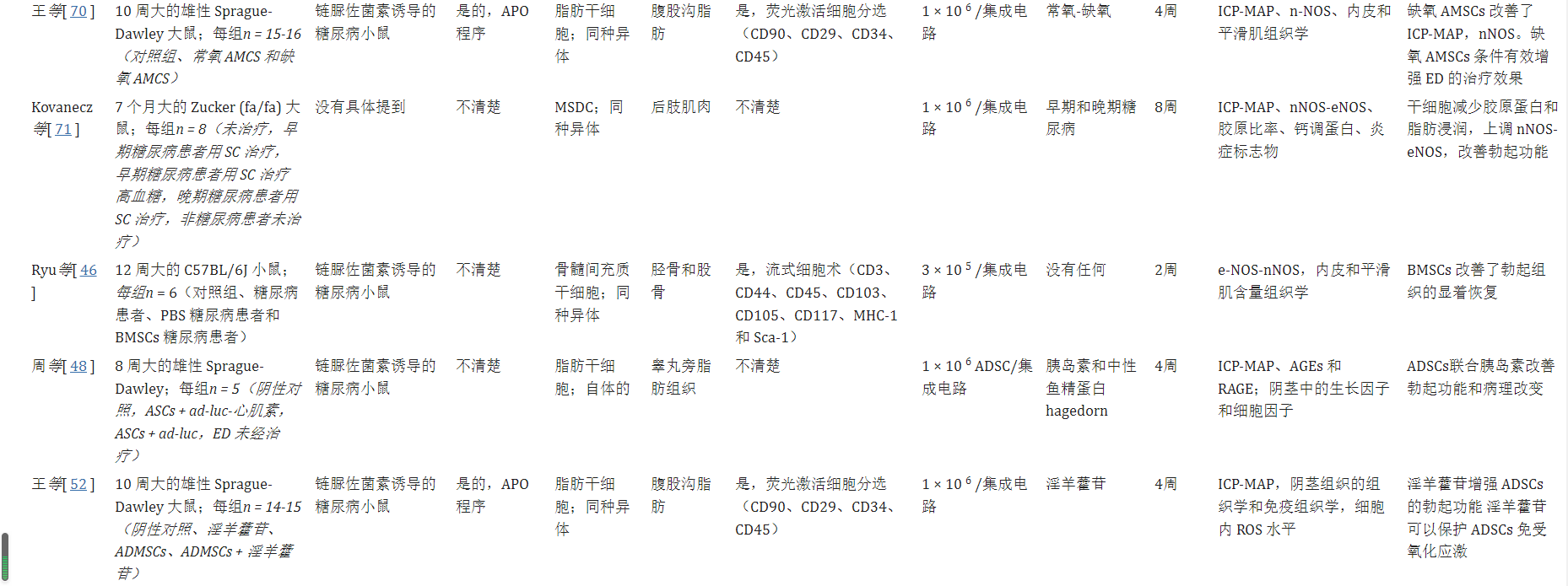 2019年,Protogerou等人報道了一種不同的方法,即使用自體脂肪干細胞治療5名DM患者的ED。將該組與其他五個接受血小板裂解物的人進行了比較。給予的干細胞數(shù)量為2×105個細胞,持續(xù)3個月。在研究結束時,在治療組和對照組之間沒有觀察到IIEF-5的差異。然而,兩組在治療前后均觀察到顯著改善。