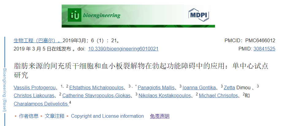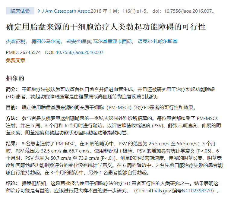 2016年,Levy等人報道了PM-SCs(胎盤基質干細胞)在8名ED患者中的應用。治療后6個月后,Levy等人得出結論,干細胞療法可改善勃起功能。