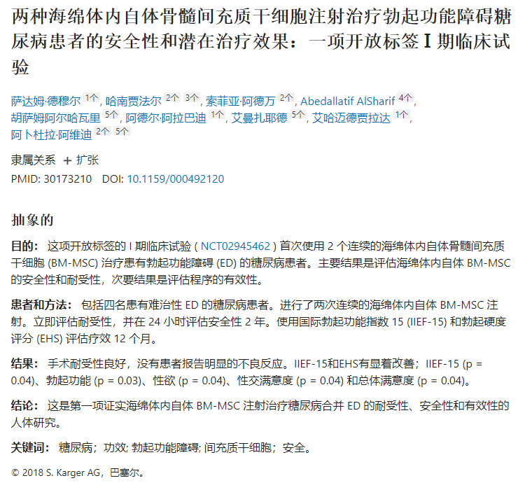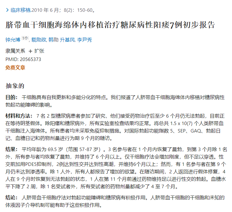 2010年,Bahk等人對7名年齡在57-87歲的糖尿病患者進行了一項研究,并將干細胞治療的效果與接受單獨PDE5抑制劑等ED治療的3名患者進行了比較。使用的干細胞是臍帶來源的間充質干細胞,劑量為1.5×107個細胞,經(jīng)體內給藥。這項研究隨訪了9個月,在研究結束時,發(fā)現(xiàn)干細胞對ED產生了積極影響,如IIEF-5、SEP、GAQ和勃起日記的改善所示。