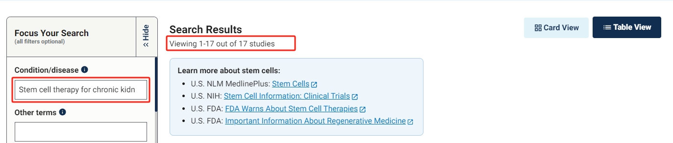 截止2023年11月,在美國國立衛(wèi)生研究院的最大臨床試驗注冊庫clinicaltrials.gov網站上注冊的有關干細胞治療慢性腎病的臨床研究項目有17項。