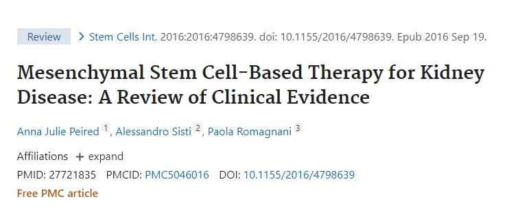 2019年,Cinzia Rota等人在《International journal of molecular sciences》雜志發(fā)表了一篇題為《 腎臟疾病的干細胞治療:進展與挑戰(zhàn) 》文章,描述了全球16項關于干細胞療法在慢性腎病領域的臨床試驗結果,總結了當前的研究進展和進入臨床應用的前景。