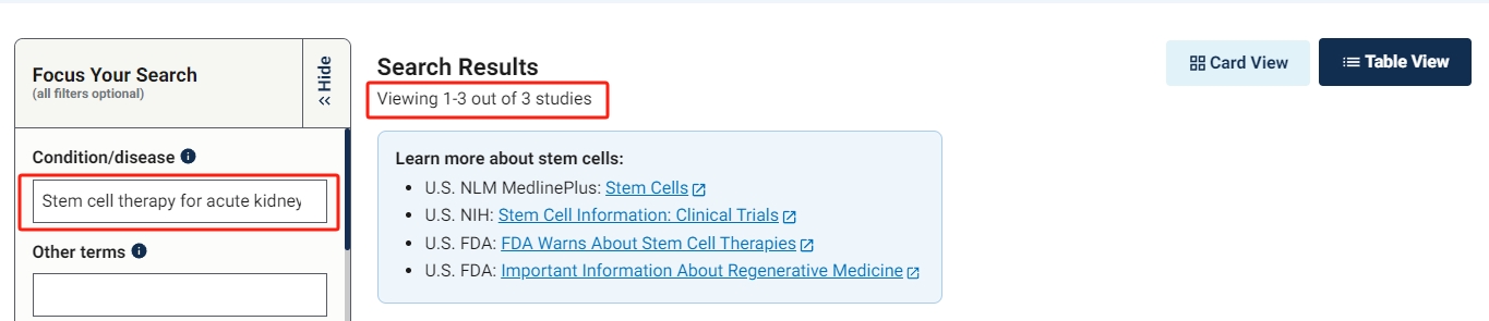 截止2023年11月,在美國國立衛(wèi)生研究院的最大臨床試驗注冊庫clinicaltrials.gov網站上注冊的有關干細胞治療急性腎損傷的臨床研究項目有3項。