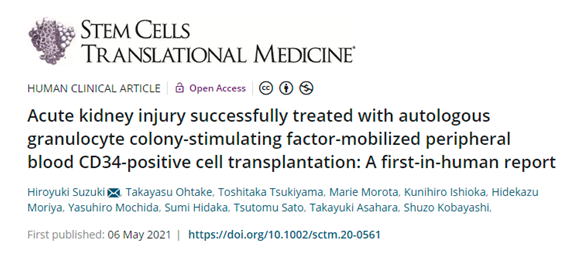 2021年,日本湘南鐮倉綜合醫(yī)院研究團隊在《干細胞轉化醫(yī)學》上發(fā)表文章,分享了利用自體干細胞移植成功治療急性腎損傷患者的經驗。
