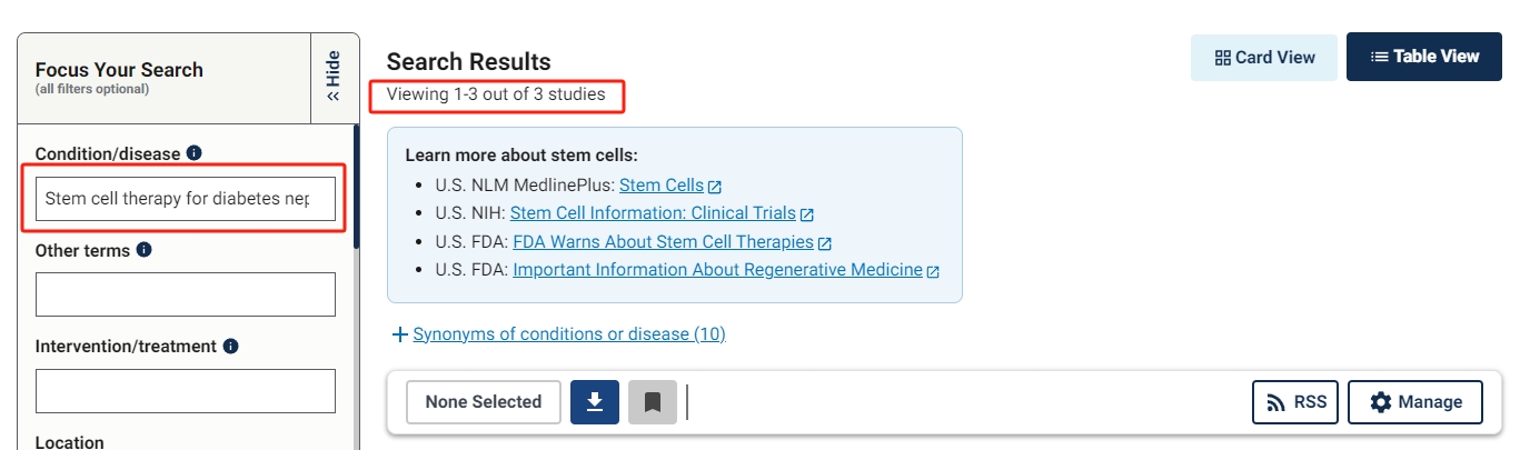 截止2023年11月,在美國國立衛(wèi)生研究院的最大臨床試驗注冊庫clinicaltrials.gov網站上注冊的有關干細胞治療糖尿病腎病的臨床研究項目有3項。