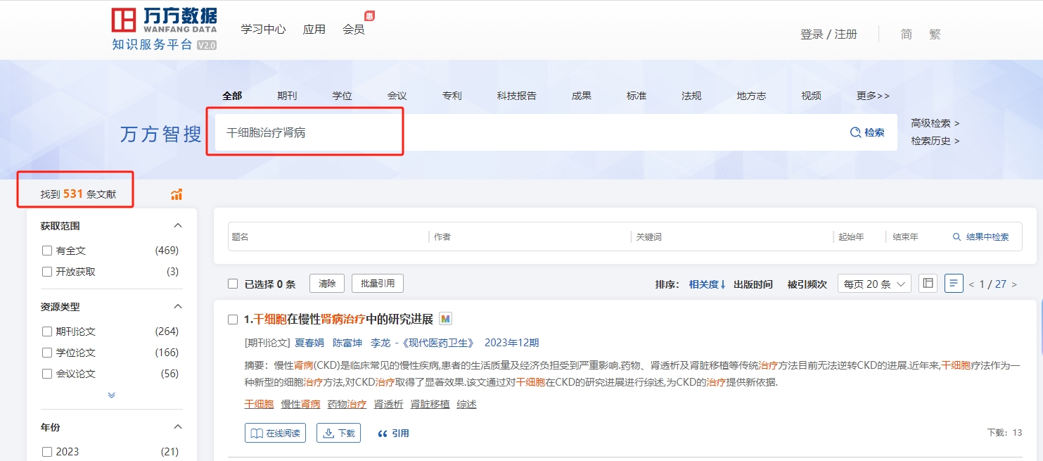 同一時間段,我們在中國萬方數(shù)據知識平臺運用關鍵詞“干細胞治療腎病”搜索相關干細胞治療腎病的文章,發(fā)現(xiàn)干細胞治療腎病的論文多達531條。