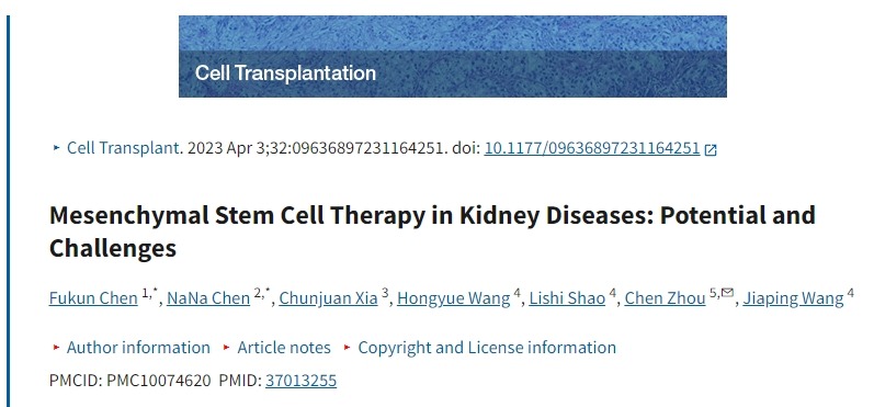 - Chen F, Chen N, Xia C, Wang H, Shao L, Zhou C, Wang J. 間充質干細胞治療腎臟疾病:潛力與挑戰。細胞移植。2023 年 1 月至 12 月;32:9636897231164251。doi:10.1177/09636897231164251。PMID:37013255;PMCID:PMC10074620。