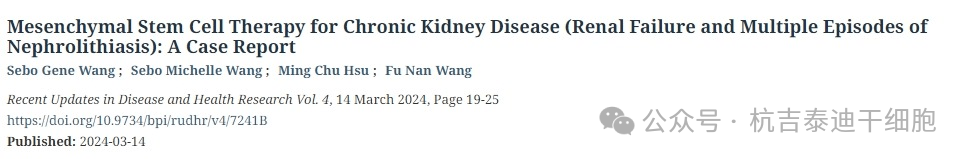 [3]:Wang, S. G. ., Wang, S. M. ., Hsu, M. C. ., & Wang, F. N. . (2024). Mesenchymal Stem Cell Therapy for Chronic Kidney Disease (Renal Failure and Multiple Episodes of Nephrolithiasis): A Case Report. Recent Updates in Disease and Health Research Vol. 4, 19–25. https://doi.org/10.9734/bpi/rudhr/v4/7241B